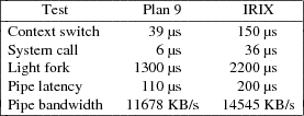 Although the Plan 9 times are not spectacular, they show that the kernel is competitive with commercial systems.