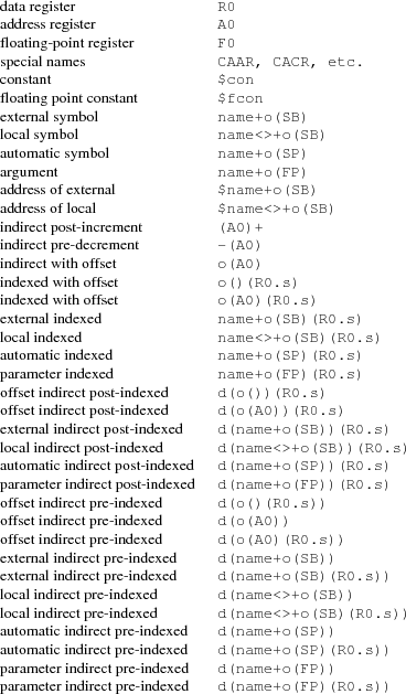 The simple addressing modes are shared by all the assemblers. Here, for completeness, follows a table of all the 68020 addressing modes, since that machine has the richest set. In the table, o is an offset, which if zero may be elided, and d is a displacement, which is a constant between -128 and 127 inclusive. Many of the modes listed have the same name; scrutiny of the format will show what default is being applied. For instance, indexed mode with no address register supplied operates as though a zero-valued register were used. For "offset" read "displacement." For ".s" read one of .L, or .W followed by *1, *2, *4, or *8 to indicate the size and scaling of the data.